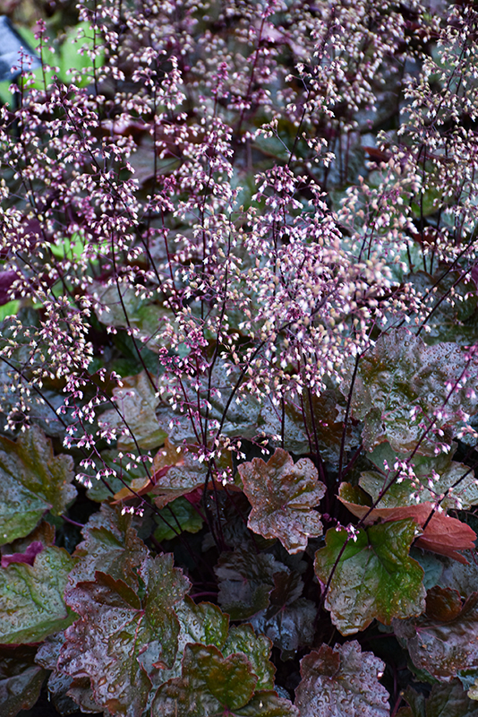 Carnival Black Olive Coral Bells will grow to be about 12 inches tall at maturity, with a spread of 14 inches. When grown in masses or used as a bedding plant, individual plants should be spaced approximately 10 inches apart. Its foliage tends to remain dense right to the ground, not requiring facer plants in front. It grows at a medium rate, and under ideal conditions can be expected to live for approximately 10 years. As an evegreen perennial, this plant will typically keep its form and foliage year-round.