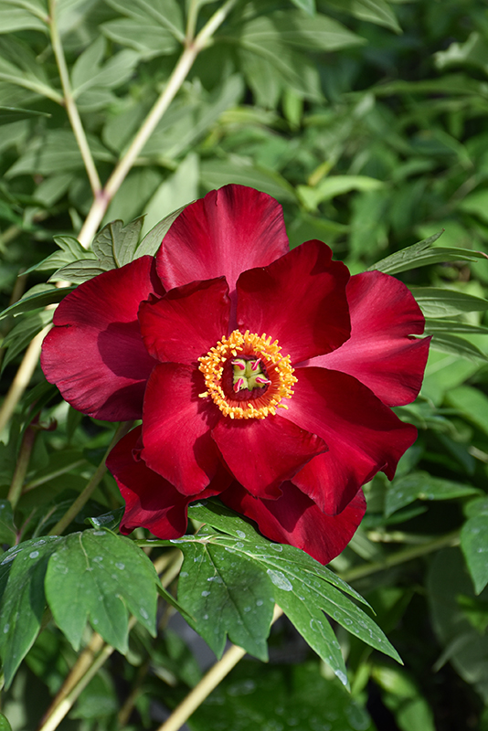 Scarlet Heaven Itoh Peony features bold lightly-scented semi-double scarlet flowers with gold anthers at the ends of the stems in late spring. The flowers are excellent for cutting. Its compound leaves remain green in colour throughout the season.