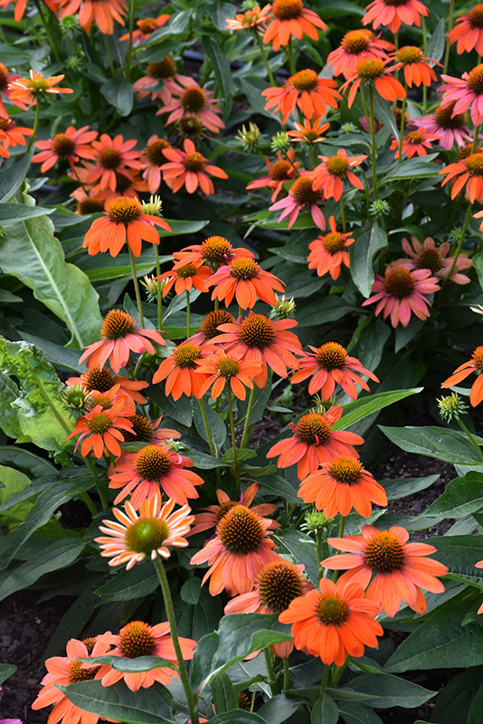 Sombrero® Fiesta Orange Coneflower will grow to be about 18 inches tall at maturity extending to 24 inches tall with the flowers, with a spread of 18 inches. Its foliage tends to remain dense right to the ground, not requiring facer plants in front. It grows at a medium rate, and under ideal conditions can be expected to live for approximately 10 years. As an herbaceous perennial, this plant will usually die back to the crown each winter, and will regrow from the base each spring. Be careful not to disturb the crown in late winter when it may not be readily seen!