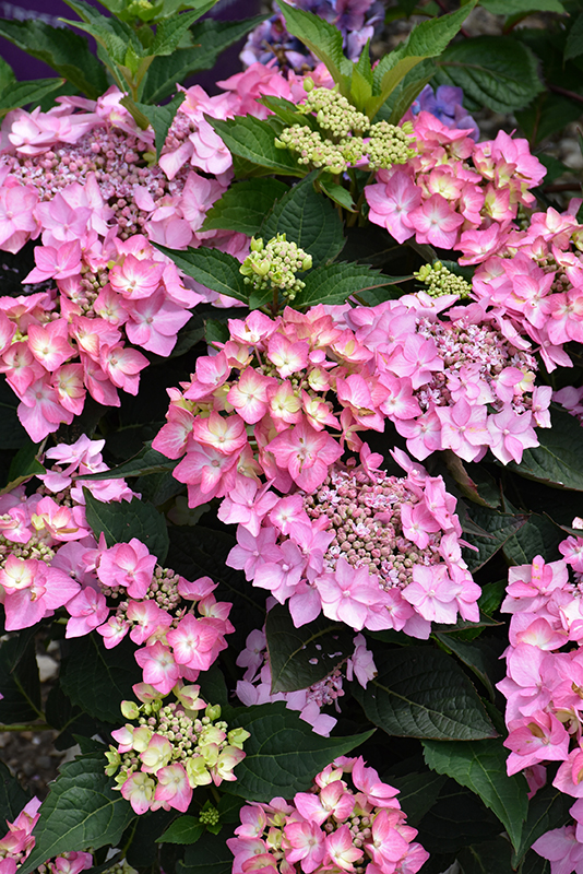 Let's Dance Can Do!® Hydrangea features bold rose lacecap flowers with lavender overtones along the branches from early summer to early fall, which emerge from distinctive light green flower buds. The flowers are excellent for cutting. It has forest green deciduous foliage. The serrated pointy leaves do not develop any appreciable fall colour.