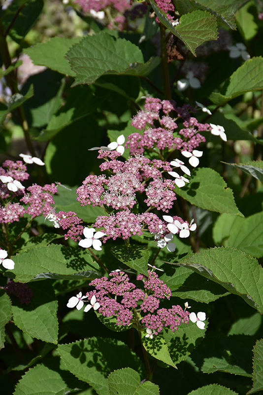 This elegant selection is the first ever smooth hydrangea with plum purple lacecap flowers and dark, ruby red stems; attractive, heart shaped foliage is nicely ridged and toothed on a graceful habit; best pruned in late winter, it blooms on new growth