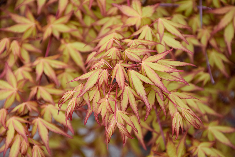 Katsura Japanese Maple is primarily valued in the landscape for its ornamental upright and spreading habit of growth. It features subtle corymbs of red flowers rising above the foliage in mid spring before the leaves. It has attractive chartreuse deciduous foliage which emerges yellow in spring. The lobed palmate leaves are highly ornamental and turn an outstanding orange in the fall. The rough gray bark and deep purple branches are extremely showy and add significant winter interest.