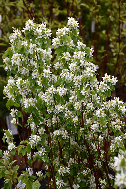 Standing Ovation™ Saskatoon Berry will grow to be about 12 feet tall at maturity, with a spread of 6 feet. It tends to be a little leggy, with a typical clearance of 2 feet from the ground, and is suitable for planting under power lines. It grows at a medium rate, and under ideal conditions can be expected to live for approximately 30 years. This is a self-pollinating variety, so it doesn't require a second plant nearby to set fruit.
