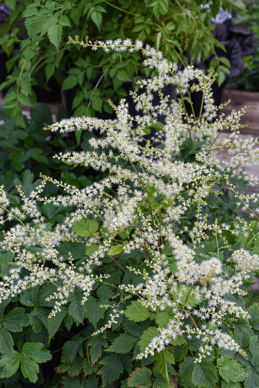 Showy, creamy white plume-like flowers on reddish stems; this compact plant has attractive ferny foliage; it does great in moist areas of the garden and doesn't like to dry out