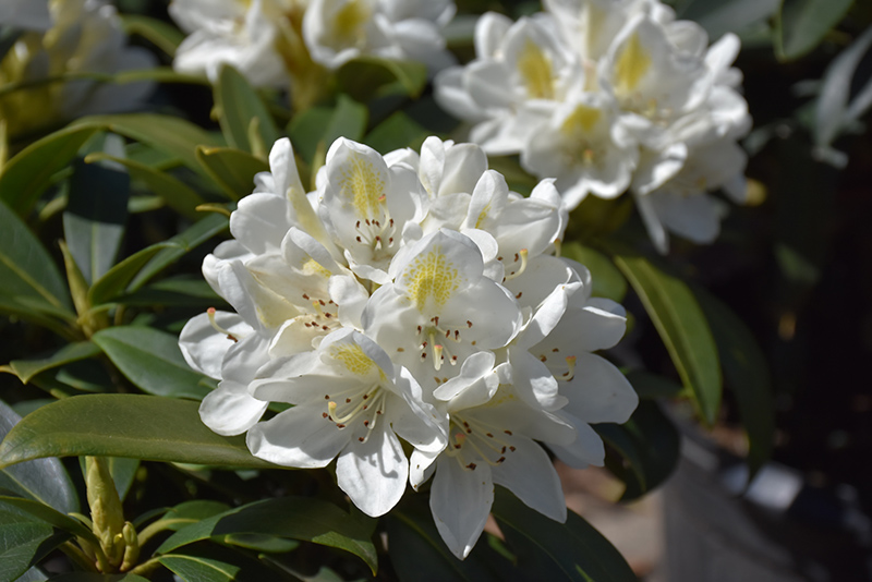 Chionoides Rhododendron is covered in stunning clusters of lightly-scented white trumpet-shaped flowers with a gold blotch at the ends of the branches in mid spring. It has dark green evergreen foliage. The glossy narrow leaves remain dark green throughout the winter.
